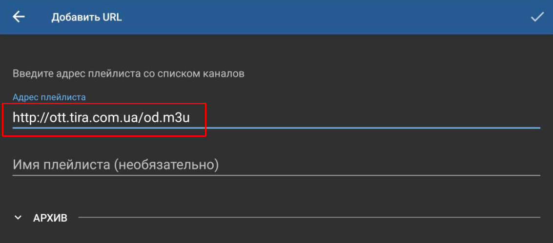 В открывшемся окне прописываем адрес плейлиста (в зависимости от Вашего месторасположения) и нажимаем кнопку «Гаразд»